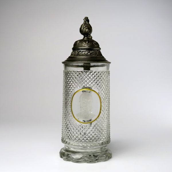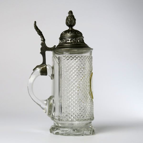 Glass Tankard - tin, clear glass - 1900 - detail of advertisement